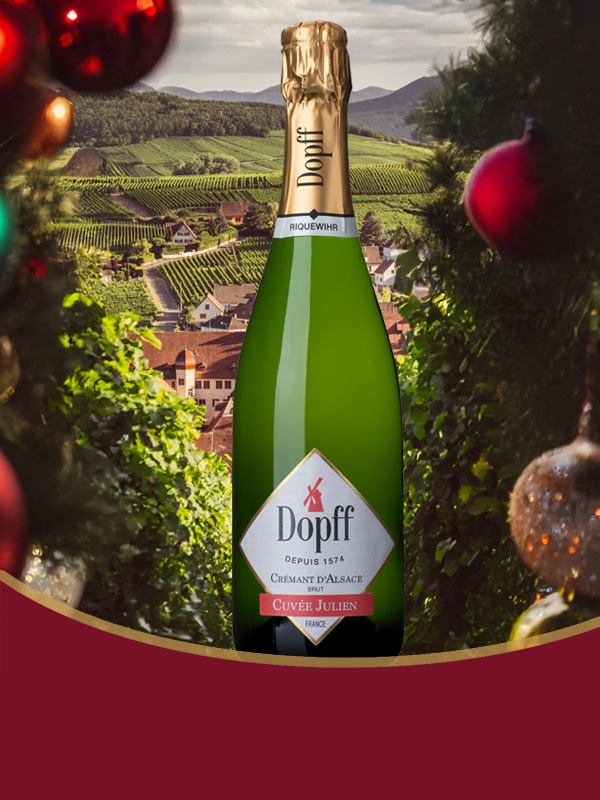 - De Dopff Cuvée Julien, een Crémant d’Alsace uit Frankrijk, staat bekend om zijn fijne bubbels en fruitige aroma’s van appel en peer. Deze wijn harmonieert mooi met klassieke hapjes zoals quiche lorraine of blini’s met zalm en crème fraîche.