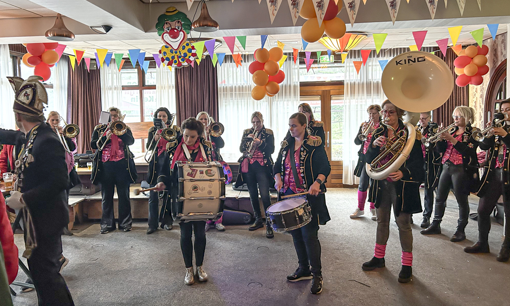 Op deze vrijdagmiddag voor het carnavalsweekend komen de Hoogheden met groot gevolg van OCV de Kadolstermennekes een aantal uurtjes bij ons op bezoek. Ze werden ook dit jaar weer door hun vaste hofkapel āDe Olnāzelse Kƶpperbloazersā muzikaal begeleid.