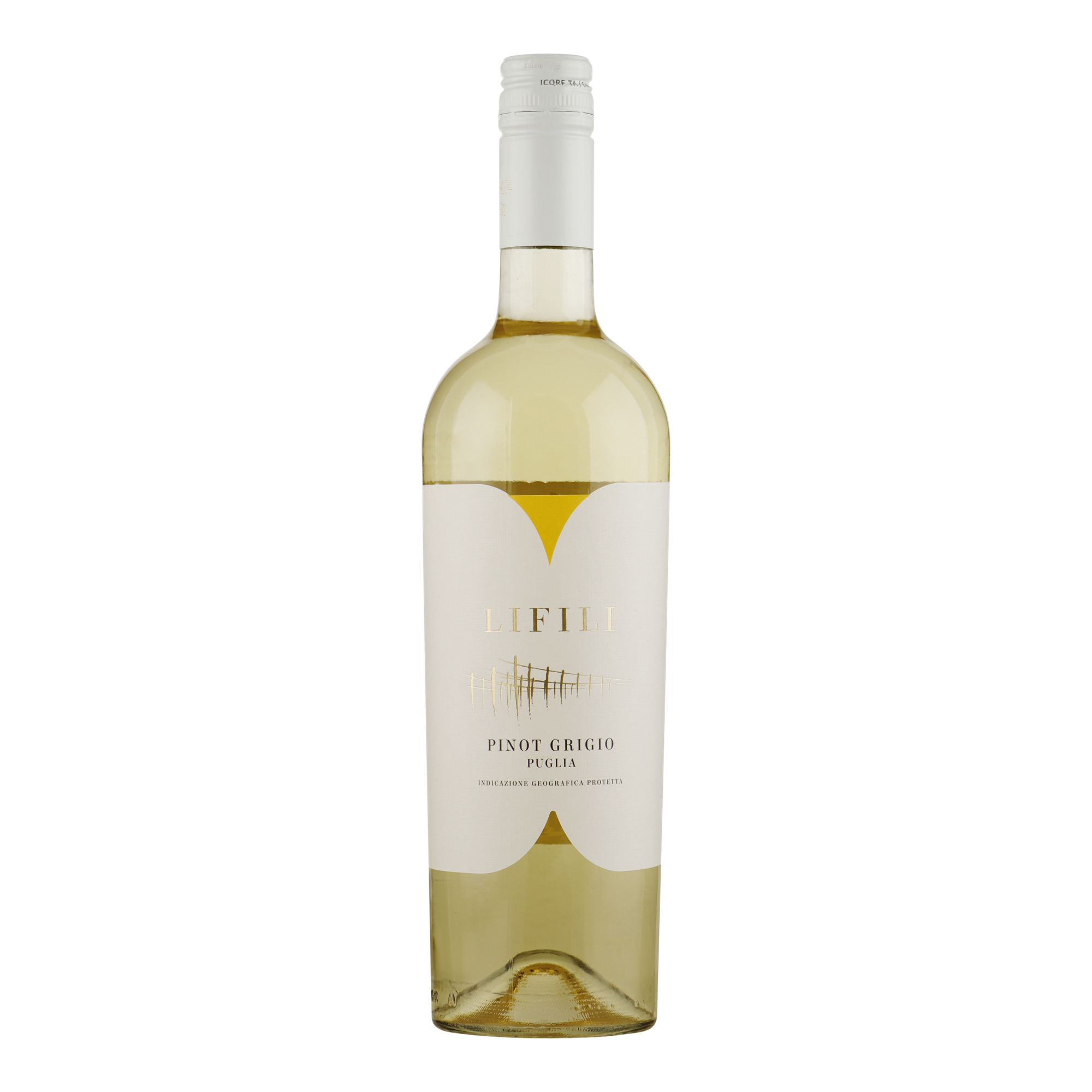 Pinot Grigio uit Puglia, het zuiden van Italië. Strogeel van kleur met groene reflecties.