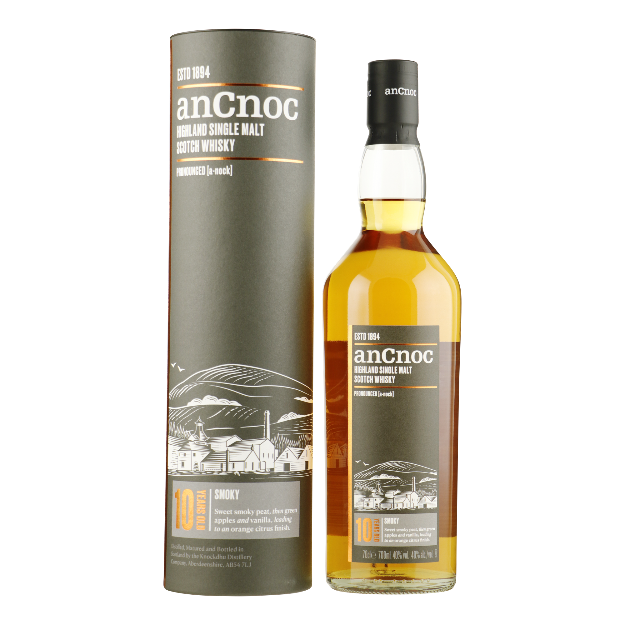 AnCnoc is een merk dat niet bang is om te innoveren en grenzen te verleggen met baanbrekende nieuwe productlanceringen. De 'moderne traditie' van anCnoc wordt weerspiegeld in het eigentijdse flesontwerp en de verpakking. Deze peated single malt heeft tien jaar lang gerijpt in de beste Amerikaanse eikenhouten vaten. Het profiel is heerlijk aromatisch waarin vanille, groene appel en citrus samenkomen met elegante, verfijnde turf. Een moderne whisky, gemaakt op traditionele wijze in een kleine, toegewijde distilleerderij.