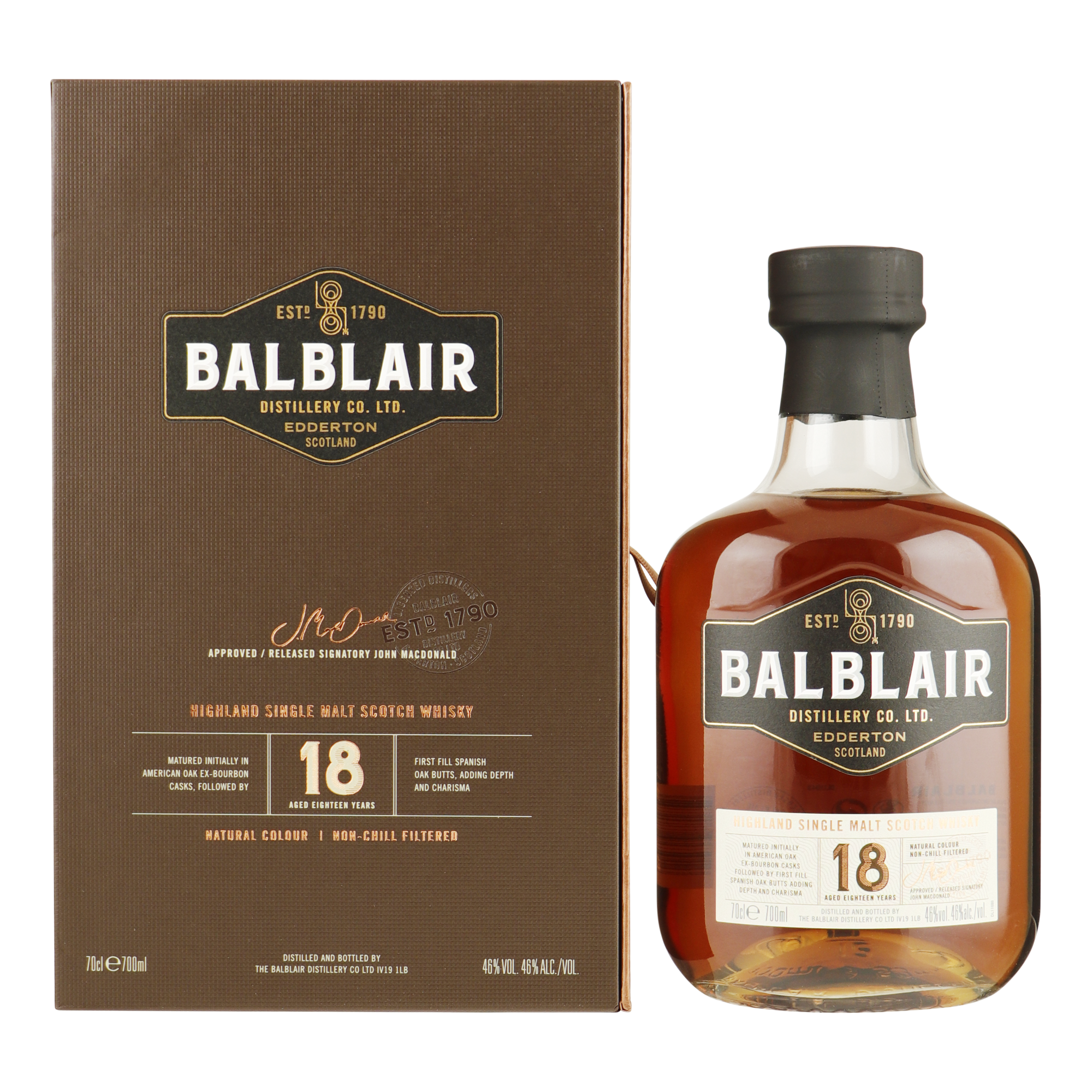 De 18 jaar oude Balblair is een meesterstuk. De single malt is evenwichtig qua smaak door eerst te zijn gerijpt in Amerikaanse eiken ex-bourbonvaten, gevolgd door Spaans eikenhouten Sherry butts die voor het eerst zijn gevuld. Deze rijping geeft extra diepte aan deze bijzondere single malt.