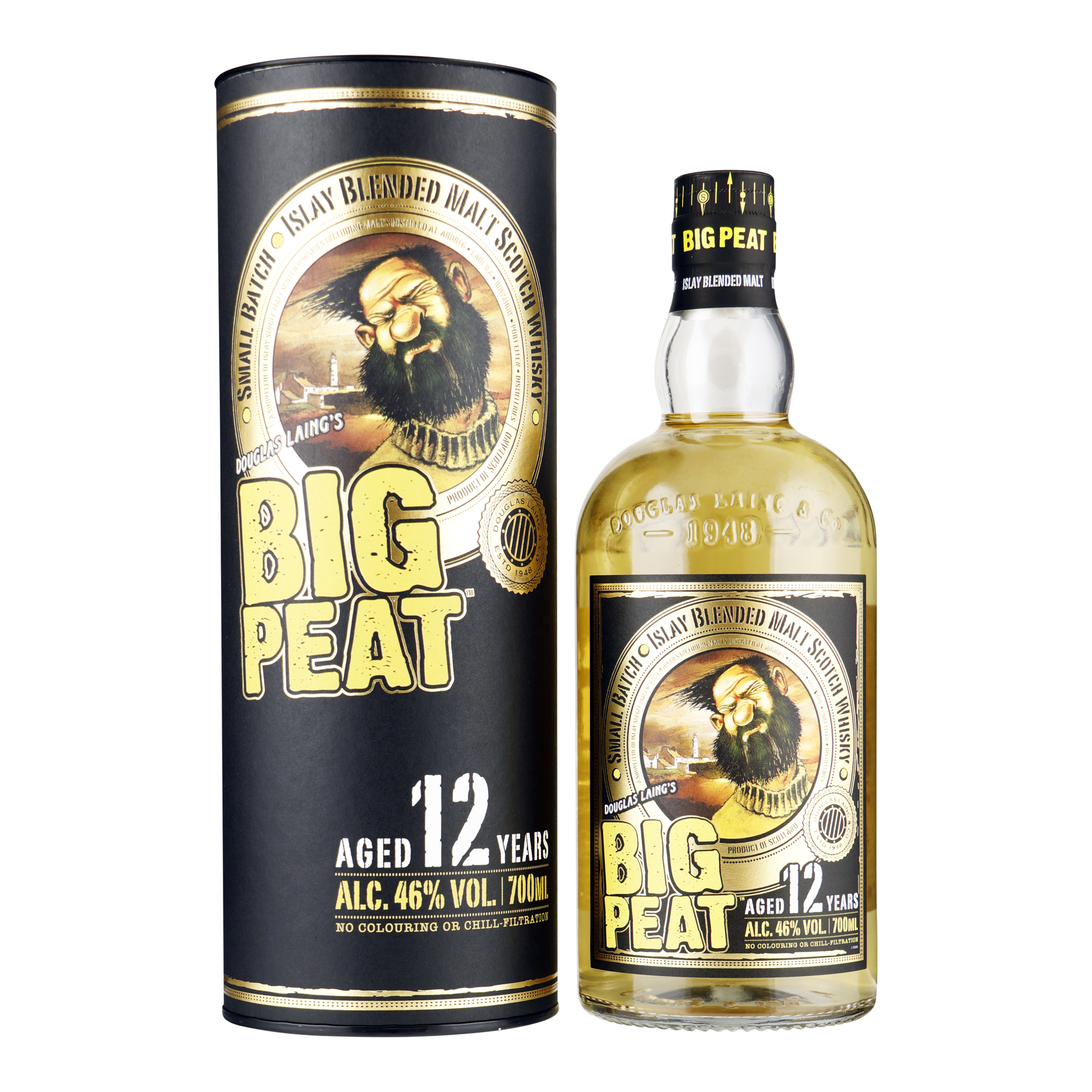 Big Peat 12 Years Old Islay Malt is een uniek huwelijk van Single Cask Single Malts, zonder kleurstoffen of chill-filtratie! Dit nieuwe aanbod is specifiek gericht op de gespecialiseerde detailhandel en is verpakt in een zwart goude hoogwaardige geschenkverpakking. Dit is de allereerste permanente Big Peat uitmonstering met een age statement!