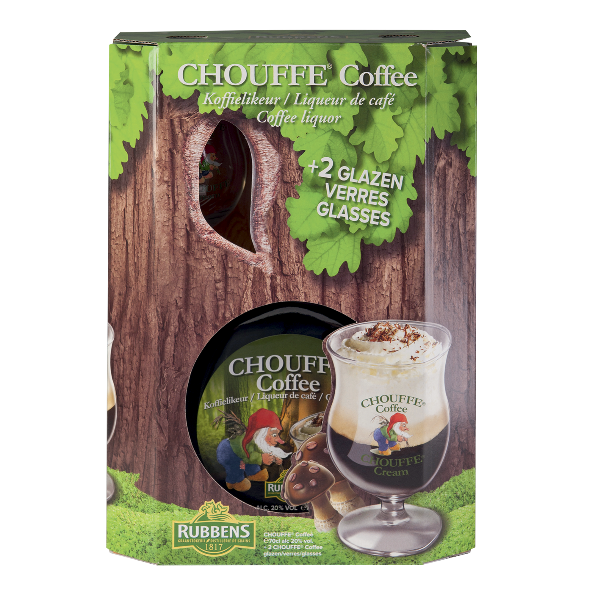 Heerlijke koffielikeur in vrolijke geschenkverpakking met twee originele CHOUFFE Coffee glaasjes en een 0,70 liter.