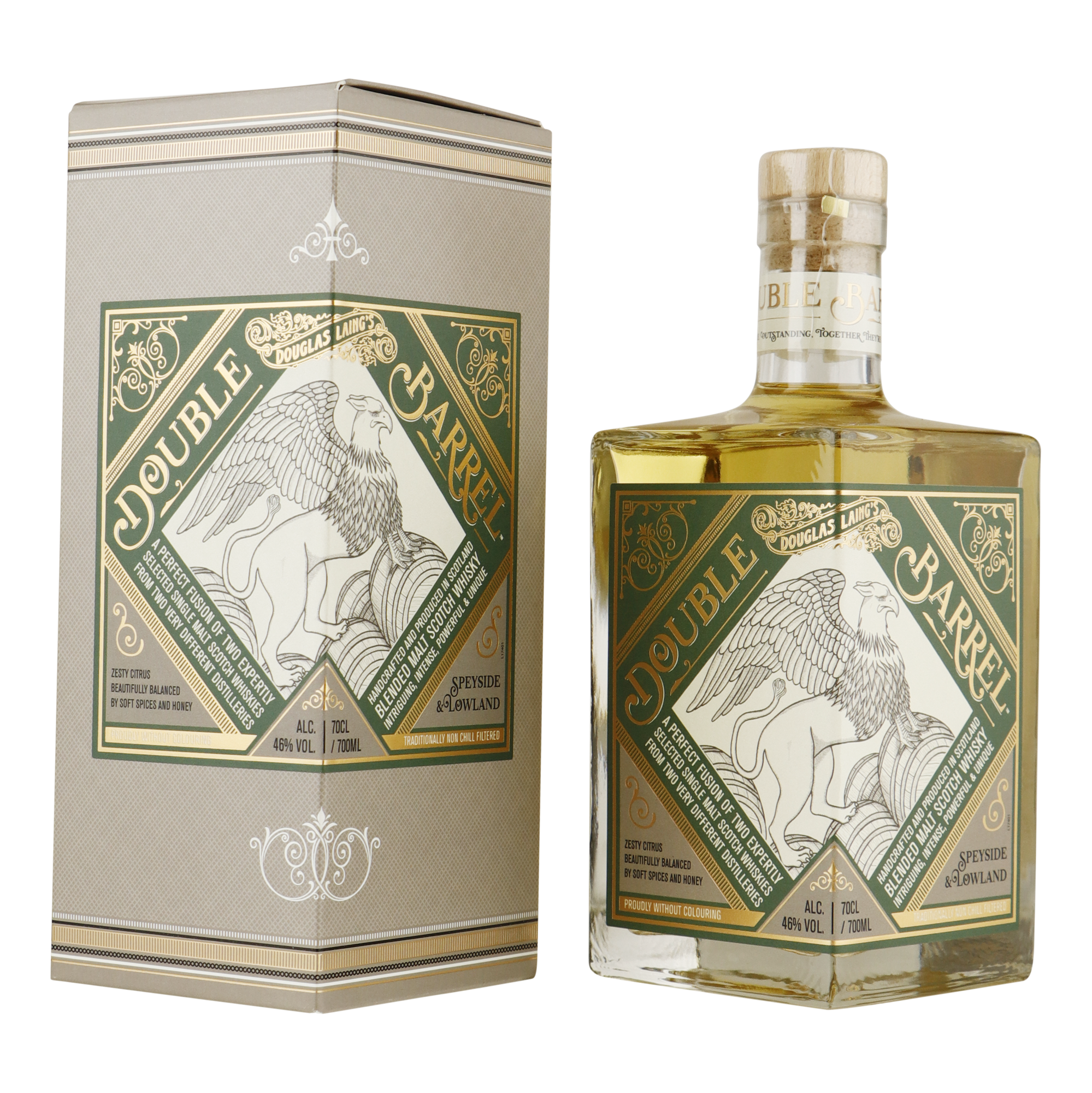 Douglas Laing heeft vakkundig twee single malts van twee verschillende distilleerderijen afkomstig uit twee whiskyregio’s zorgvuldig gecombineerd om tot één uitzonderlijke ervaring te komen, namelijk: Double Barrel.