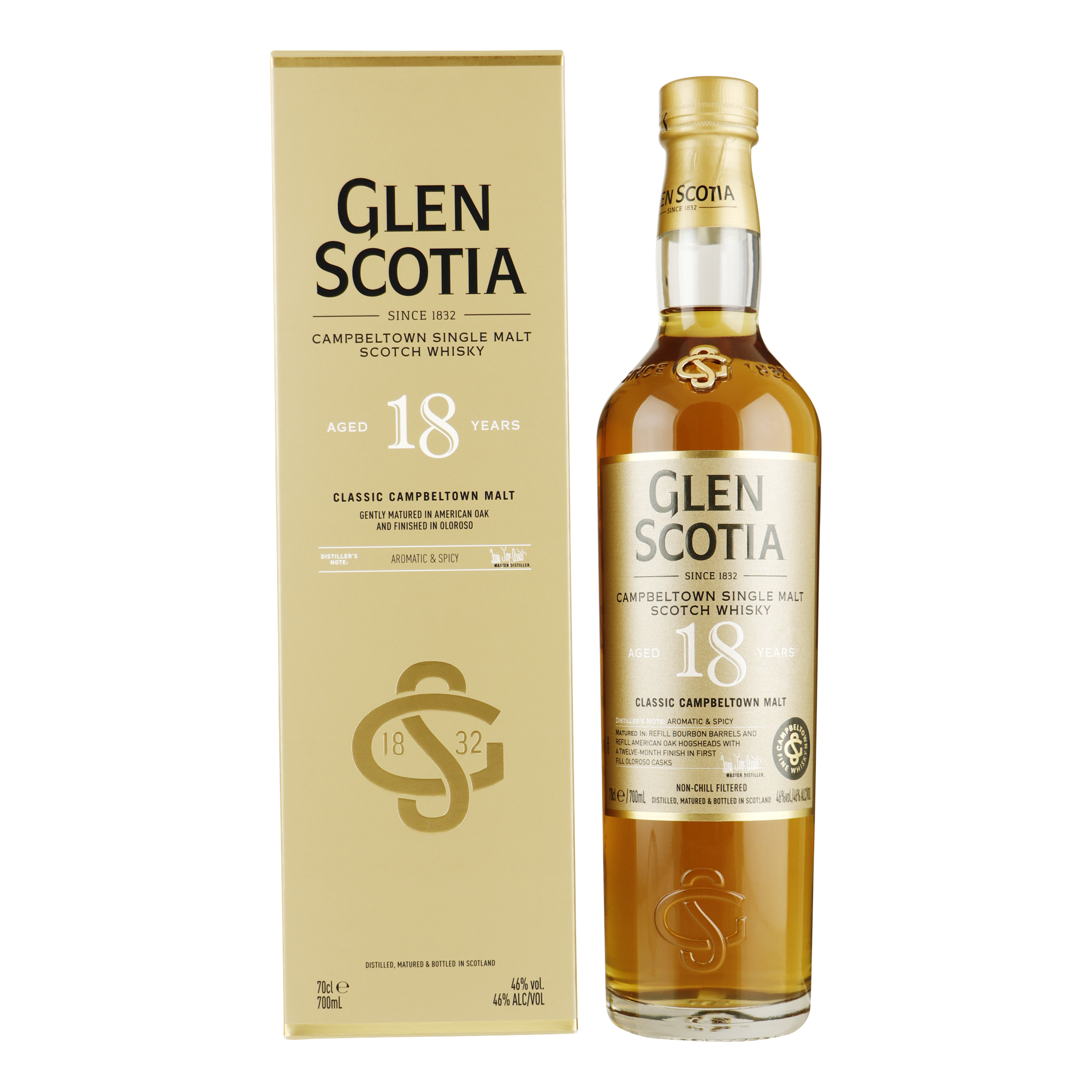 Deze Campbeltown whisky Glen Scotia 18 years heeft 18 jaar gerijpt in ex-bourbon vaten. Hierdoor ontstaat een bijzondere combinatie van complexe aroma's. Zacht en rond van smaak. Citrustonen als limoen en grapefruit gecombineerd met gember en kaneel. Gevolgd door perzik en ahornsiroop. Een mooie gebalanceerde afdronk met pecannootjes en toffee.