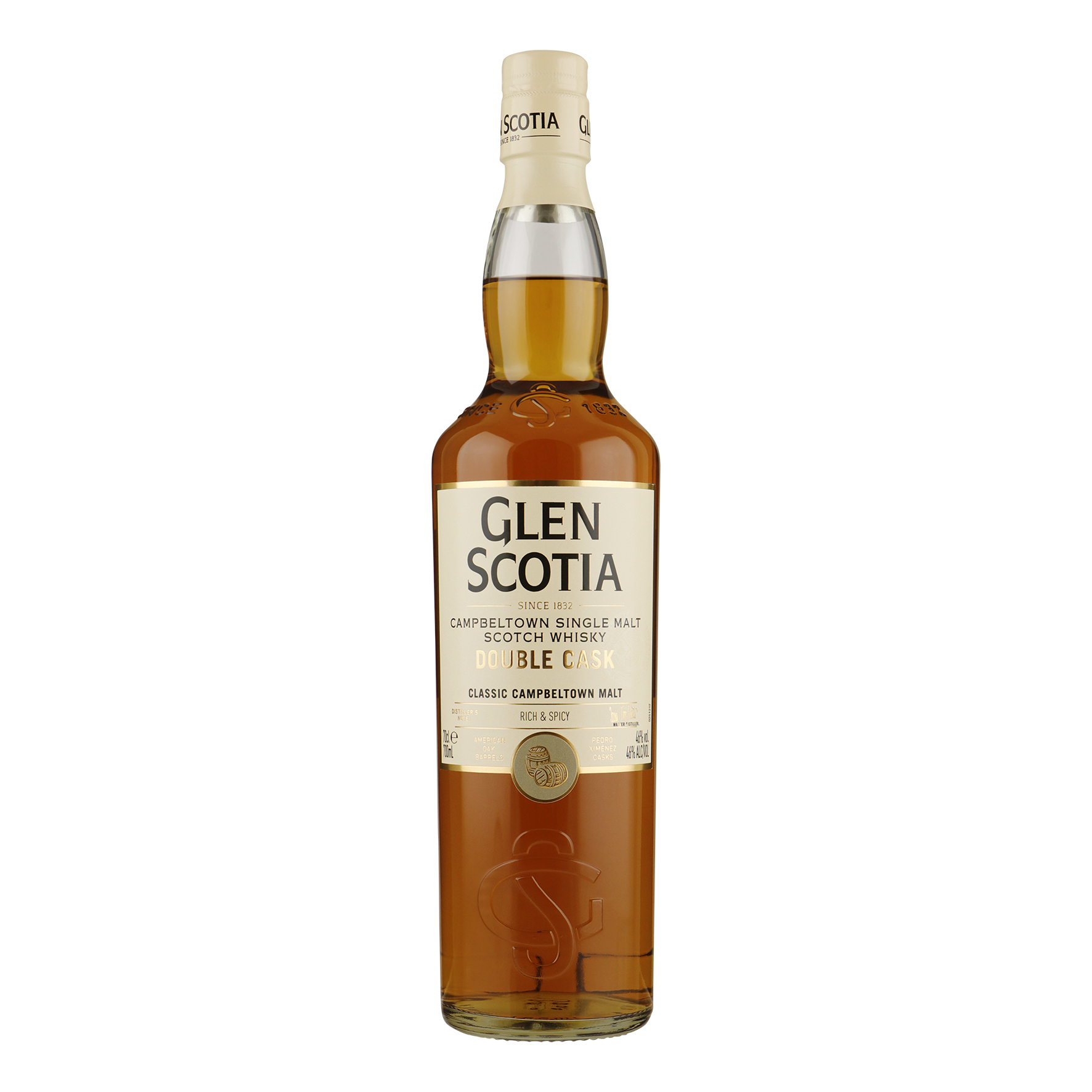 De Glen Scotia Double Cask heeft eerst gerijpt in first-fill bourbonvaten, voordat de whisky twaalf maanden in PX-sherryvaten een tweede lagering heeft ondergaan. Hierdoor biedt deze expressie een verrassende harmonie van rijke en kruidige fruitsmaken, evenals uitgesproken Campbeltown-tonen.