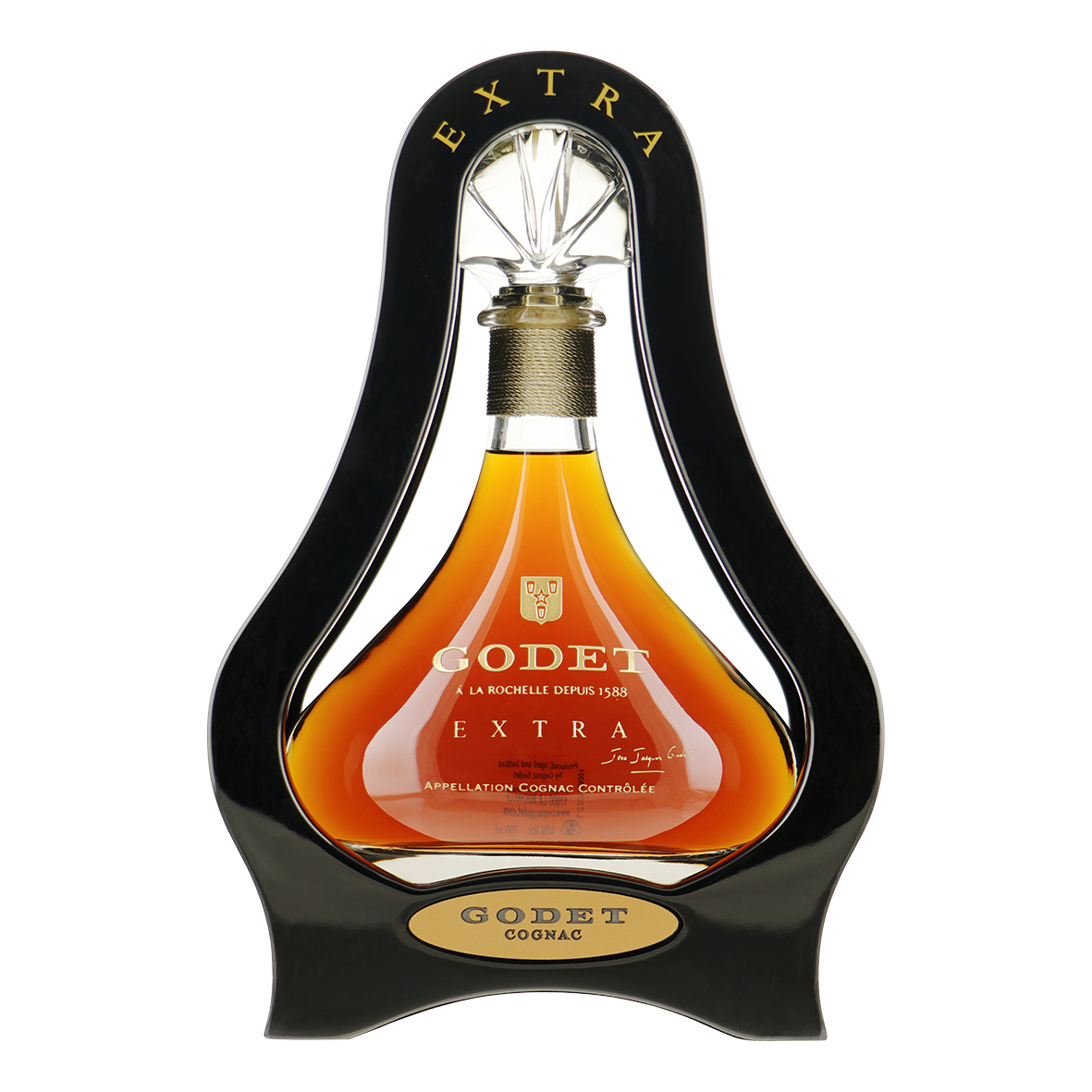 De Godet Extra is een unieke en luxe geschenkverpakking van de familie Godet. Deze prachtige handgemaakte fles bevat ‘Hors d’Age’ cognac van 20 tot 70 jaar oud. De fluweelachtige aroma’s in deze cognac worden aangevuld met pittige tonen van droge bloemen.