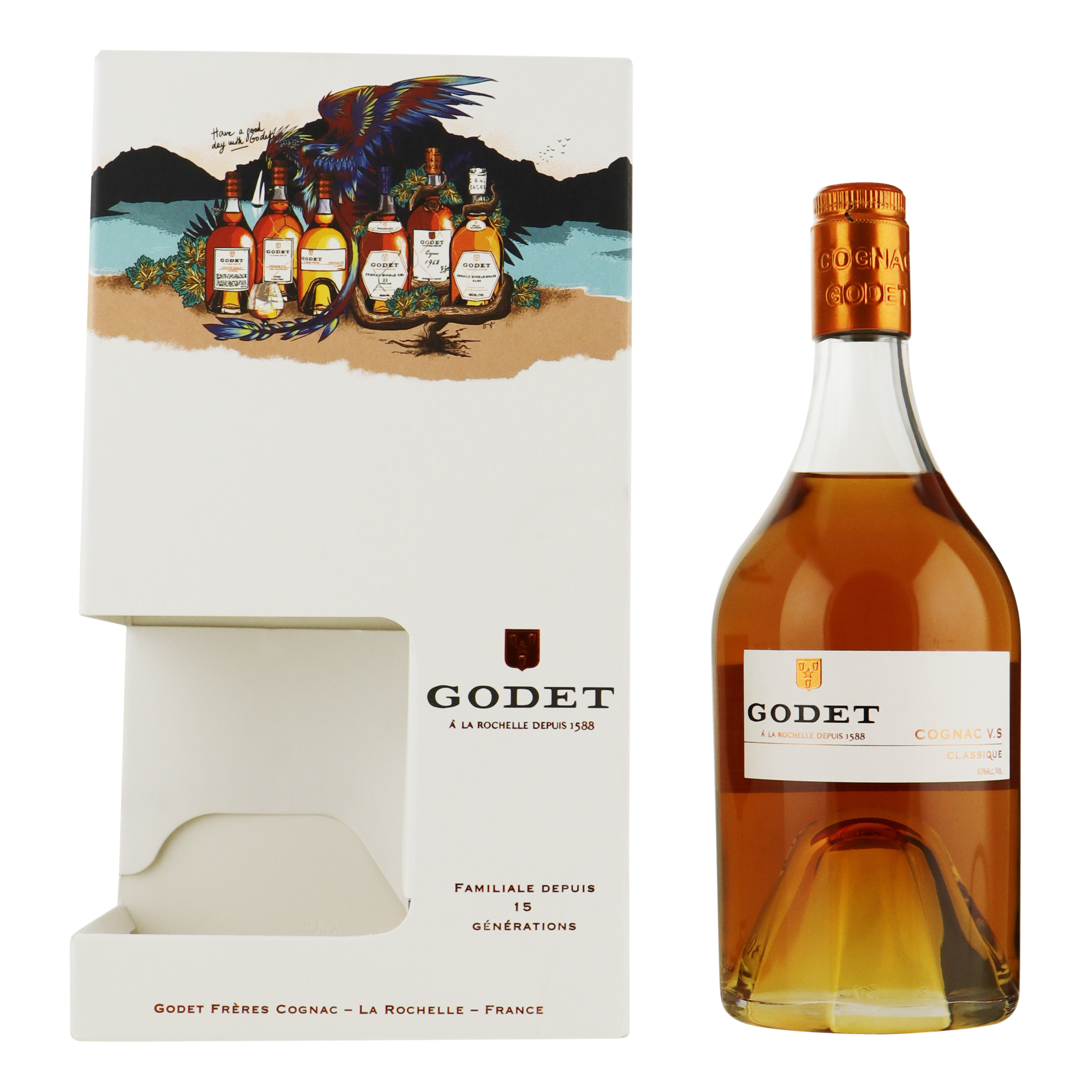 Godet VS is de jongste cognac in de 'Great Classics' reeks van Godet. Een blend van verschillende Cru's, dubbel gedistilleerd en gerijpt in vaten van Frans eikenhout. De blend bestaat uit cognac uit de gebieden Fins Bois en Bons Bois. Deze VS belichaamt de inventieve kant van de eerste cognac-distilleerders die hun wijnen letterlijk brandden om de kwaliteit te behouden. Ze ontdekten dat deze eau-de-vie, eenmaal in een eiken vat, sterk verbeterde naarmate de tijd verstreek. Dit was het begin van het verhaal van de Cognac.