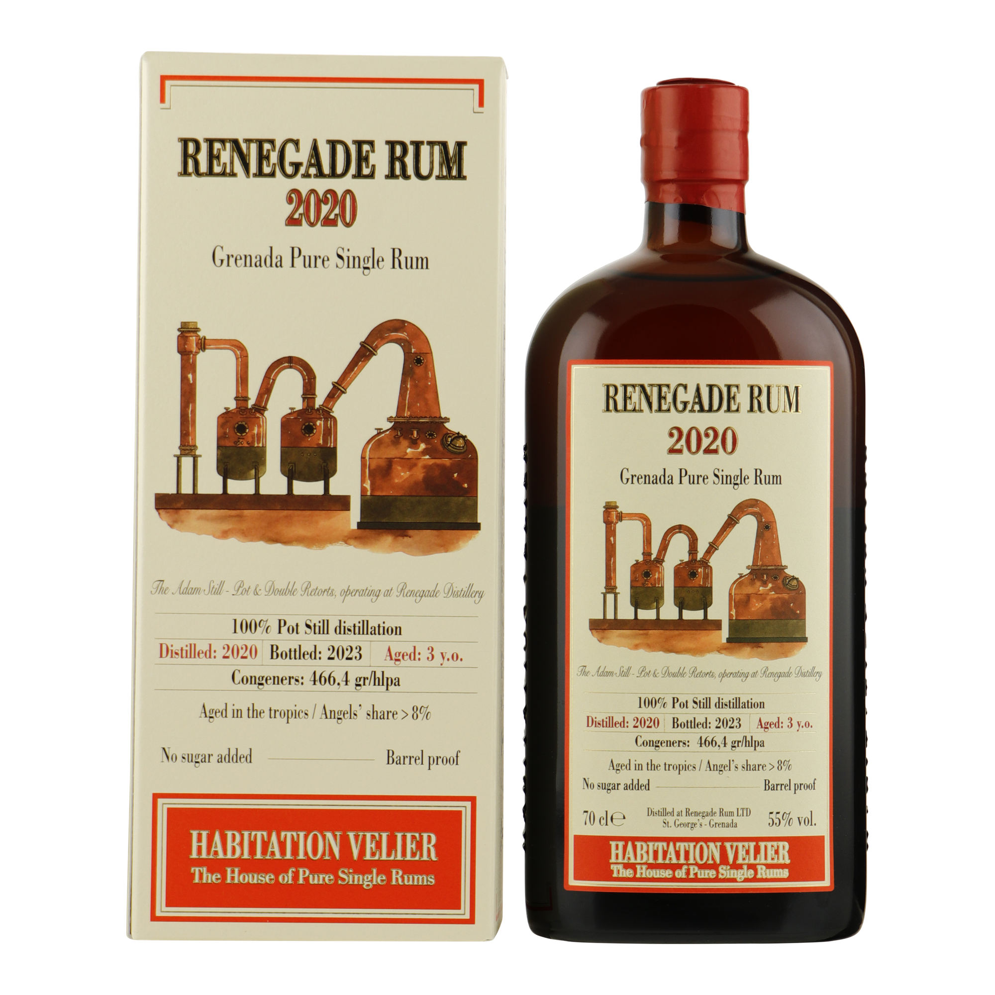 Habitation Velier Renegade 3YO wordt volledig geproduceerd uit twee lokale suikerrietsoorten: Lacalome Red & Yellow Lady Cristalline. Deze kleine batch is gekweekt op verschillende percelen van de distilleerderij en is gerijpt in drie verschillende soorten vaten (Frans eiken: 17%, Amerikaans nieuw eiken: 23% en ex-bourbon: 60%).