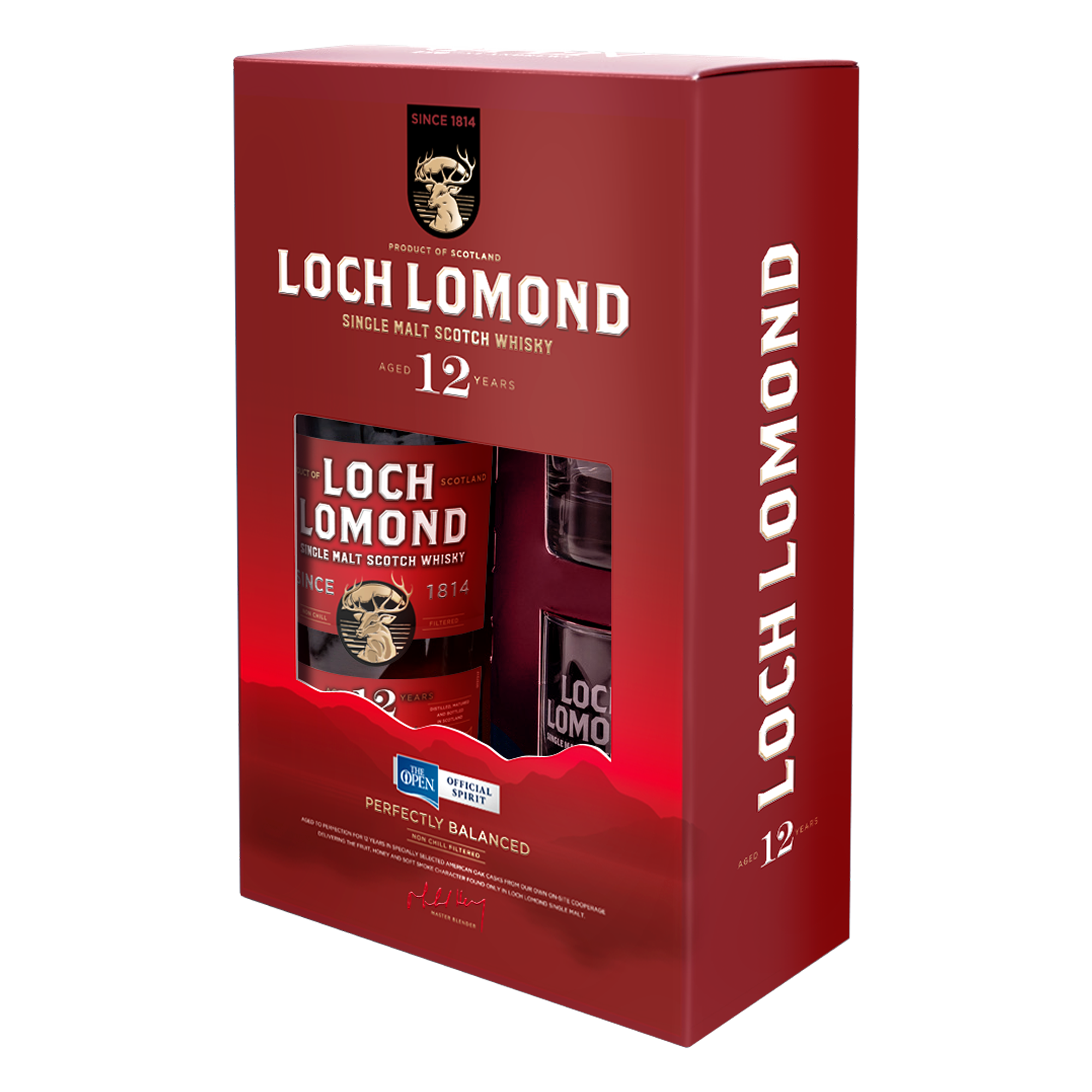 Prachtige geschenkverpakking met een fles Loch Lomond 12YO voorzien van twee premium whiskyglazen.