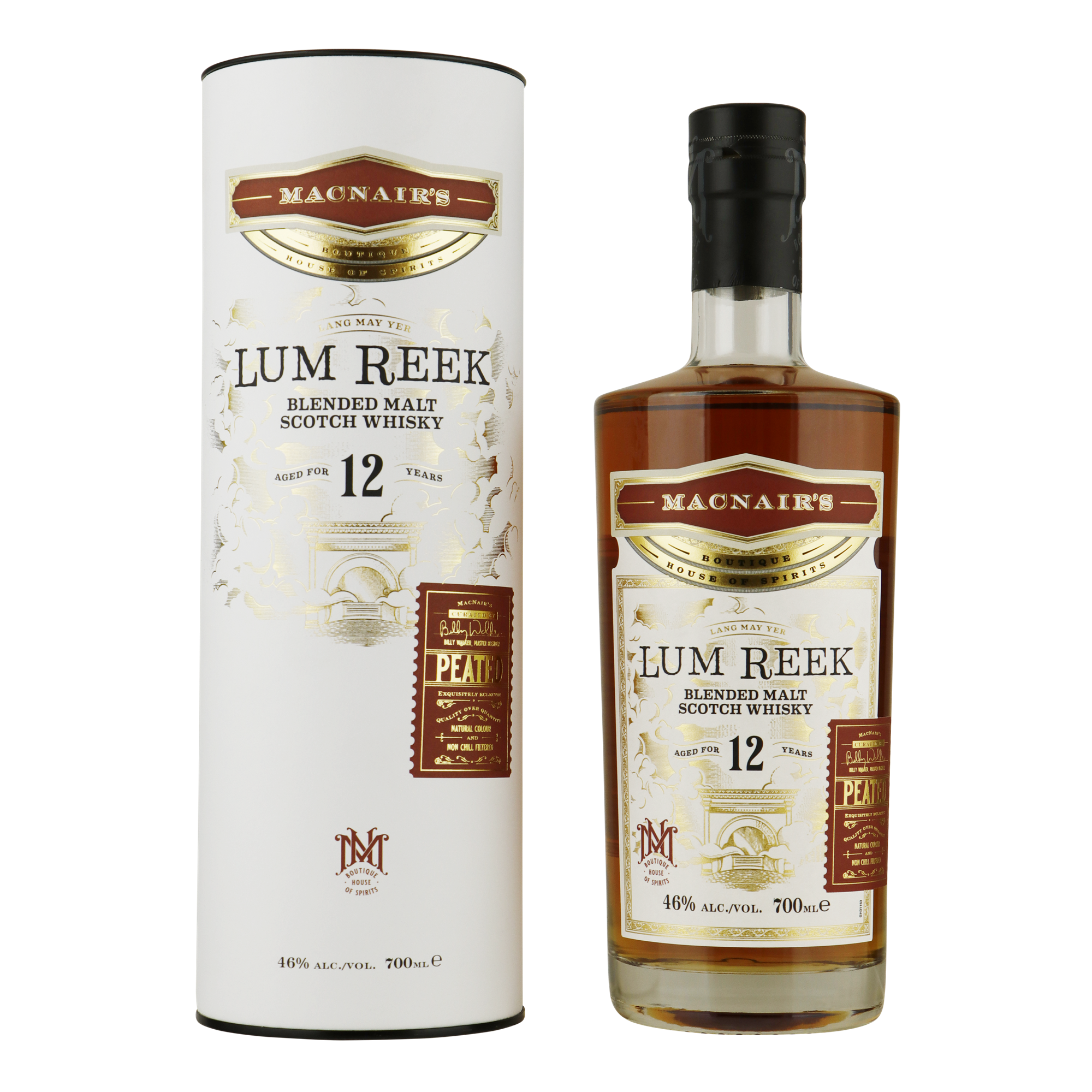 De MacNair's Lum Reek 12 jaar oud weerspiegelt Billy Walker zijn enorme ervaring als master blender, zijn creatieve vaardigheden en zijn deskundige kennis van houtbeheer. Een combinatie van whisky's die hebben gerijpt op bourbon, rode wijn en pedro ximenez vaten werden samen gemengd om deze rokerige malt te produceren.