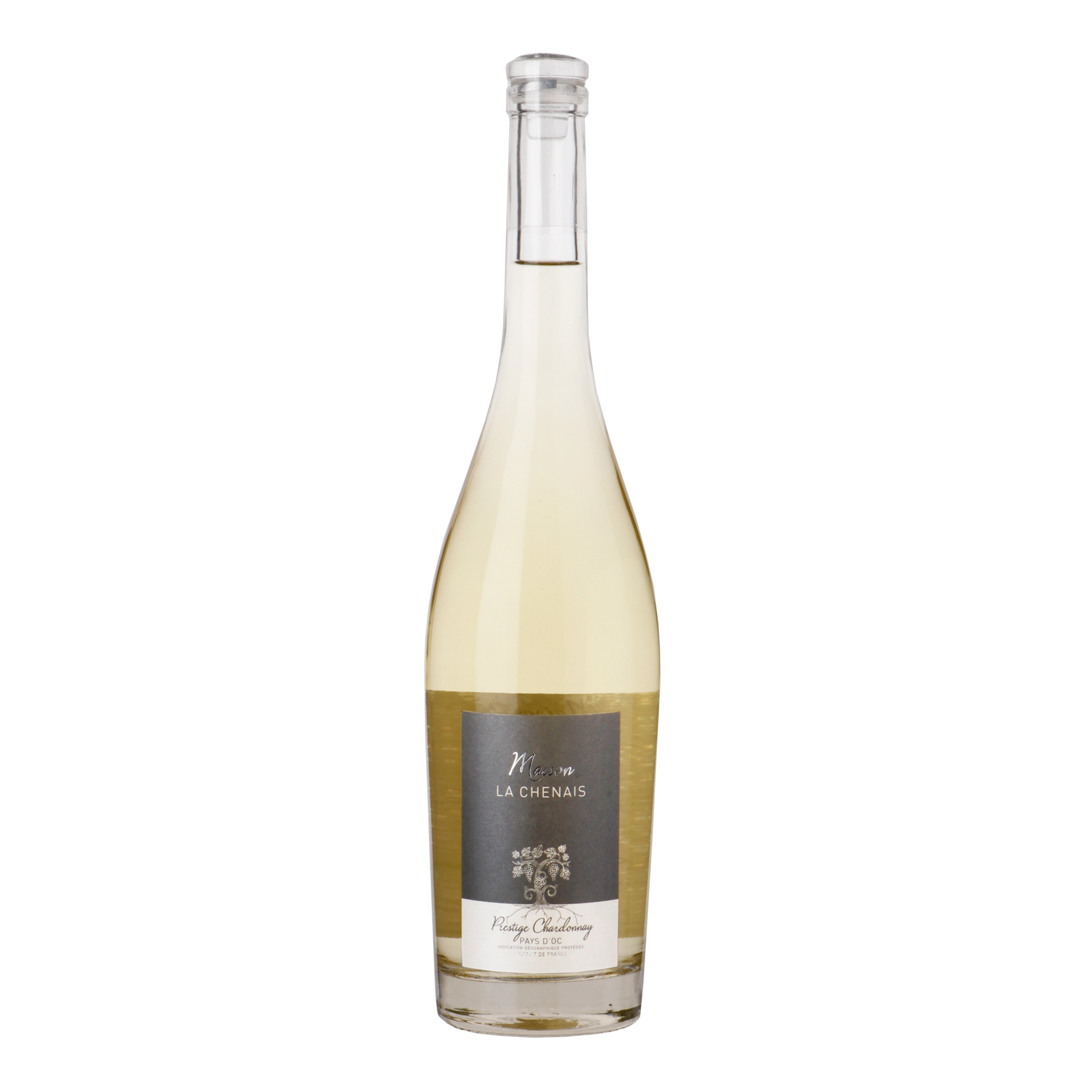 De Maison la Chenais Prestige chardonnay fles is afgesloten met een vinolok. Deze glazen afsluiter past naadloos op de fles en zorgt door middel van een kleine kunststof ring voor een hermetische afsluiting.