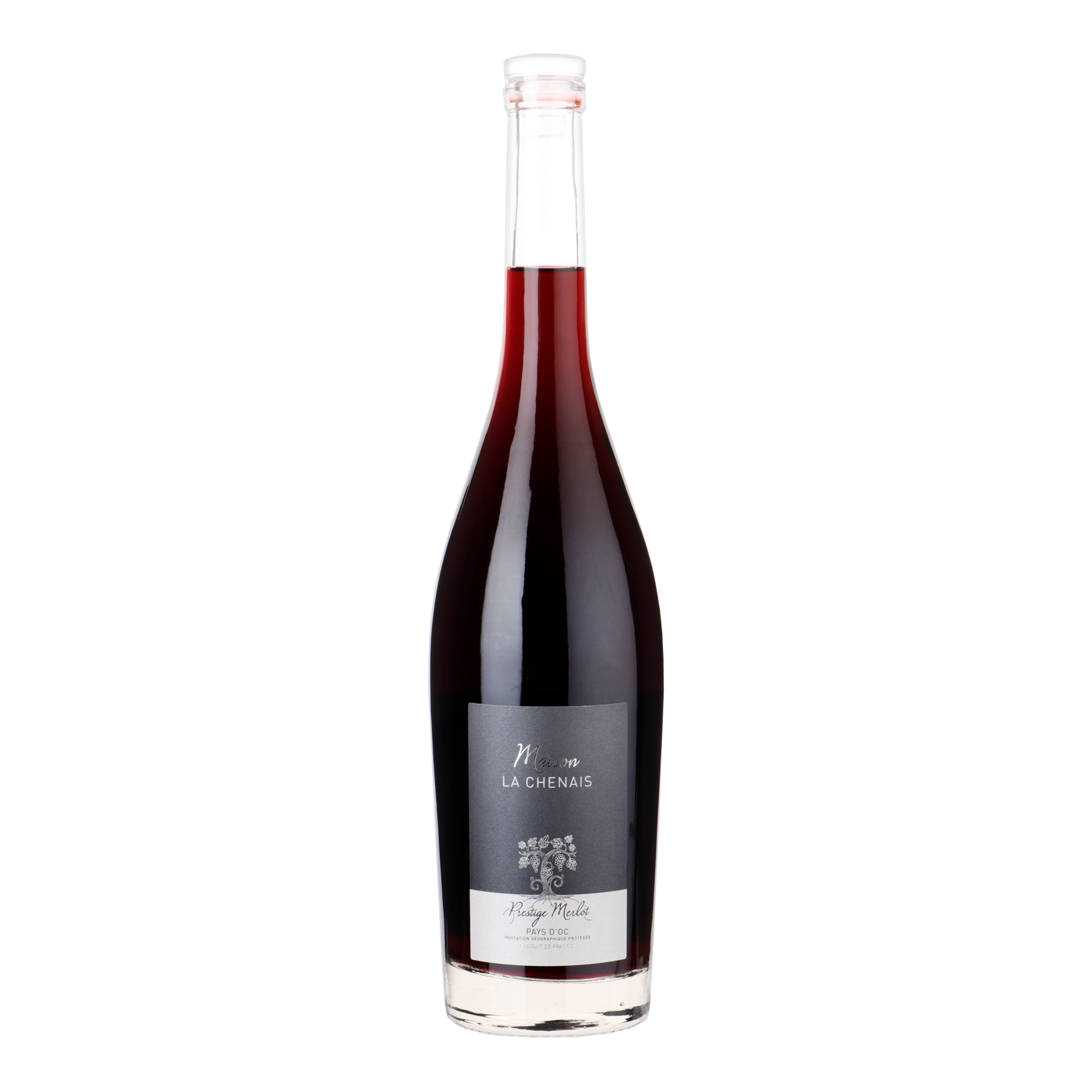 De Maison la Chenais Prestige merlot fles is afgesloten met een vinolok. Deze glazen afsluiter past naadloos op de fles en zorgt door middel van een kleine kunststof ring voor een hermetische afsluiting.