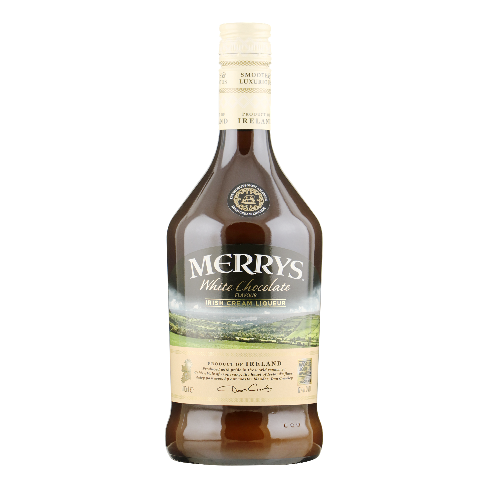 Merrys White Chocolate Irish Cream Liqueur is een elegante Ierse roomlikeur uit County Tipperary, Ierland. Gemaakt van de allerbeste verse room uit de vruchtbare Golden Vale en vakkundig gemengd met verfijnde, gerijpte Ierse whiskey.