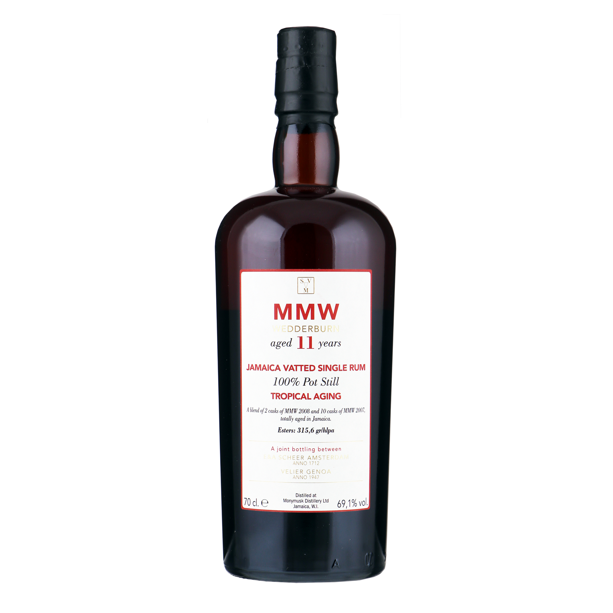 Geselecteerd door de Nederlandse onafhankelijke bottelaar Scheer en de Italiaanse welbekende rum specialist Velier! Deze versie heeft 100% van zijn tijd gerijpt in het tropische klimaat van Jamaica en is een blend van twee vaten gedistilleerd in 2008 en 10 vaten gedistilleerd in 2007, 100% pot still. Het is onderdeel van de Wedderburn categorie rums geproduceerd door de Monymusk-Clarendon distilleerderij en heeft een extreem hoog ester gehalte van 315,6 gram per hectoliter pure alcohol. Het nodigt ons uit om een palet aan smaken en aroma’s te ontdekken dat zich heen en weer beweegt tussen uitbundigheid, originaliteit en classicisme.