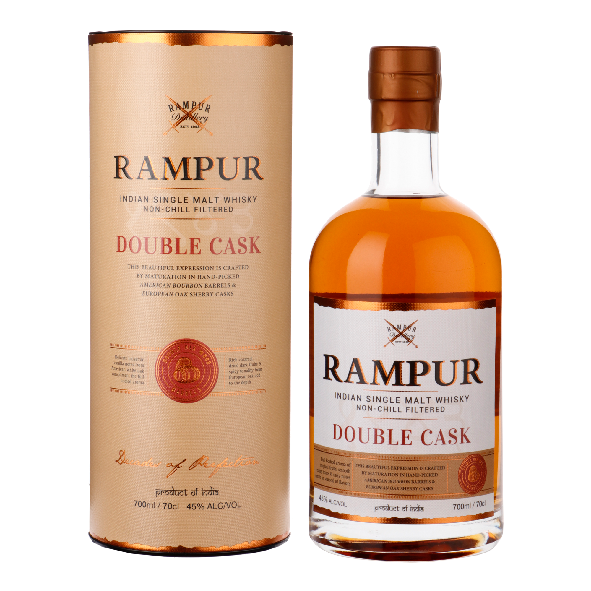 Rampur Double Cask is niet koud gefiltreerd, heeft de natuurlijke kleur en heeft respectievelijk op bourbon- en sherryvaten gelagerd.
