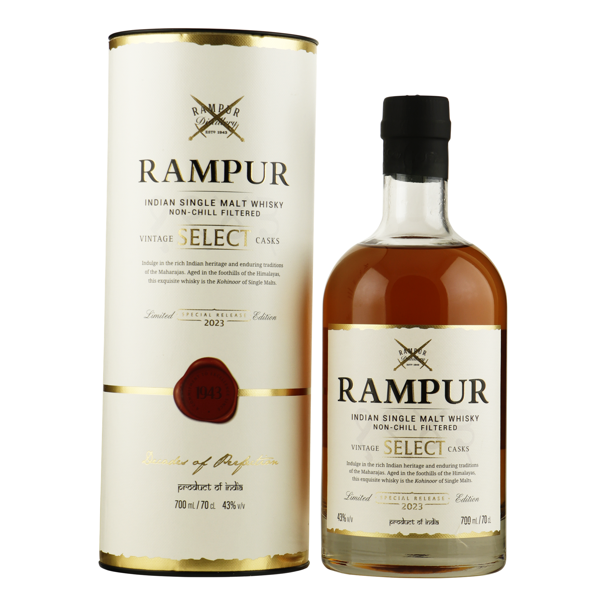 Rampur Select Indian Single Malt is een speciale release uit 2023 die ode brengt aan de het rijke Indiase erfgoed en de blijvende tradities van de Maharadja’s. De Maharadja’s waren belangrijke personen die vroeger over de Indiase koninkrijken heersten. Rampur staat bekend als de ‘Kohinoor’ van de Indian single malt whisky's, de ‘Kohinoor’ is namelijk ’s werelds bekendste diamant, die uiteraard enorm uitzonderlijk is. Deze single malt whisky bestaande uit een select aantal vintage casks van Rampur is dan ook een zeer fijn geslepen diamant.