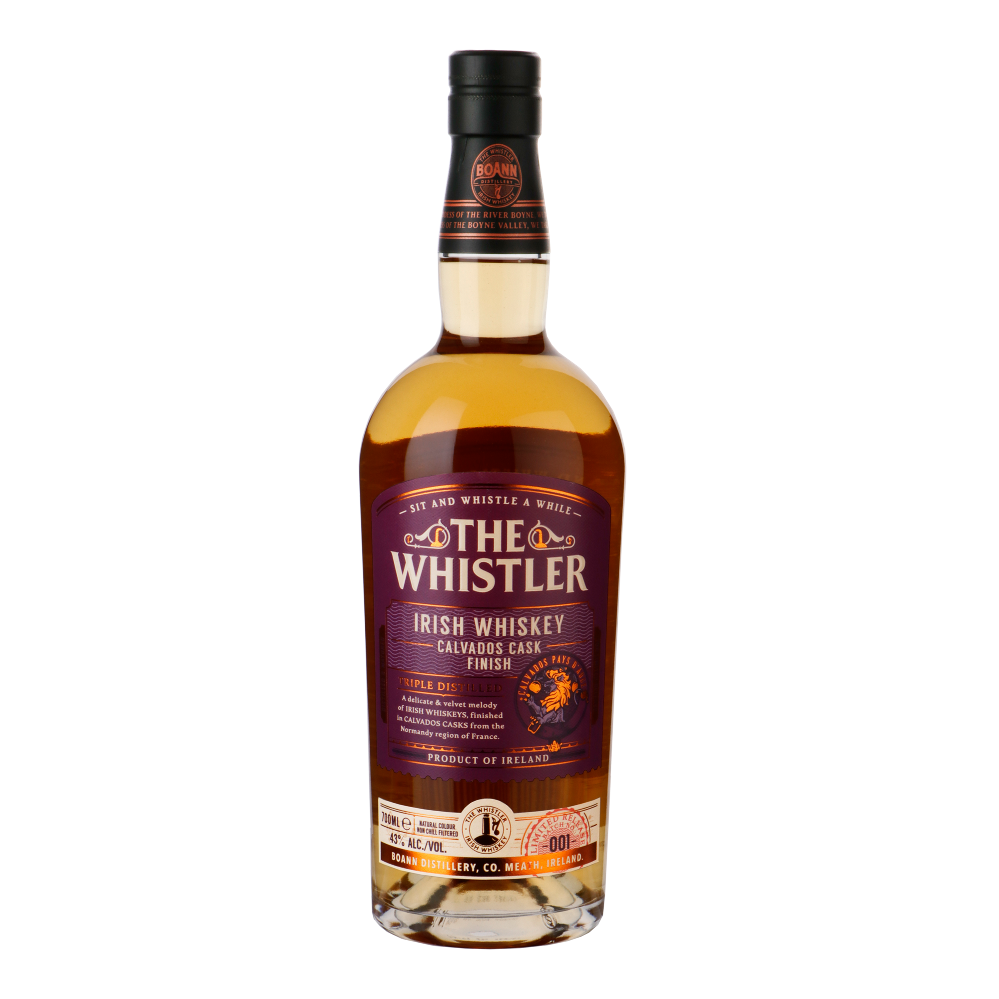 The Whistler Calvados Cask Finish is een limited edition in de Whistler Cask Finish range. Drie keer gedistilleerd, waardoor hij extra zacht is. Het is een blend van 35% Single Malt Irish Whiskey en 65% Grain Irish Whiskey. Het is de zelfde initiële blend als de Oloroso Cask Finish, waardoor het interessant is om deze twee naast elkaar te proeven en de invloed van het vat te onderzoeken. The Whistler Cavados Cask Finish wordt minimaal vier jaar in ex-bourbon vaten gerijpt, waarna het een finish van minimaal 15 maanden krijgt in ex-Calvados vaten van befaamd Calvados huis 'Chateau du Breuil', in Normandië. Non-chill filtered en in zijn natuurlijke kleur.
