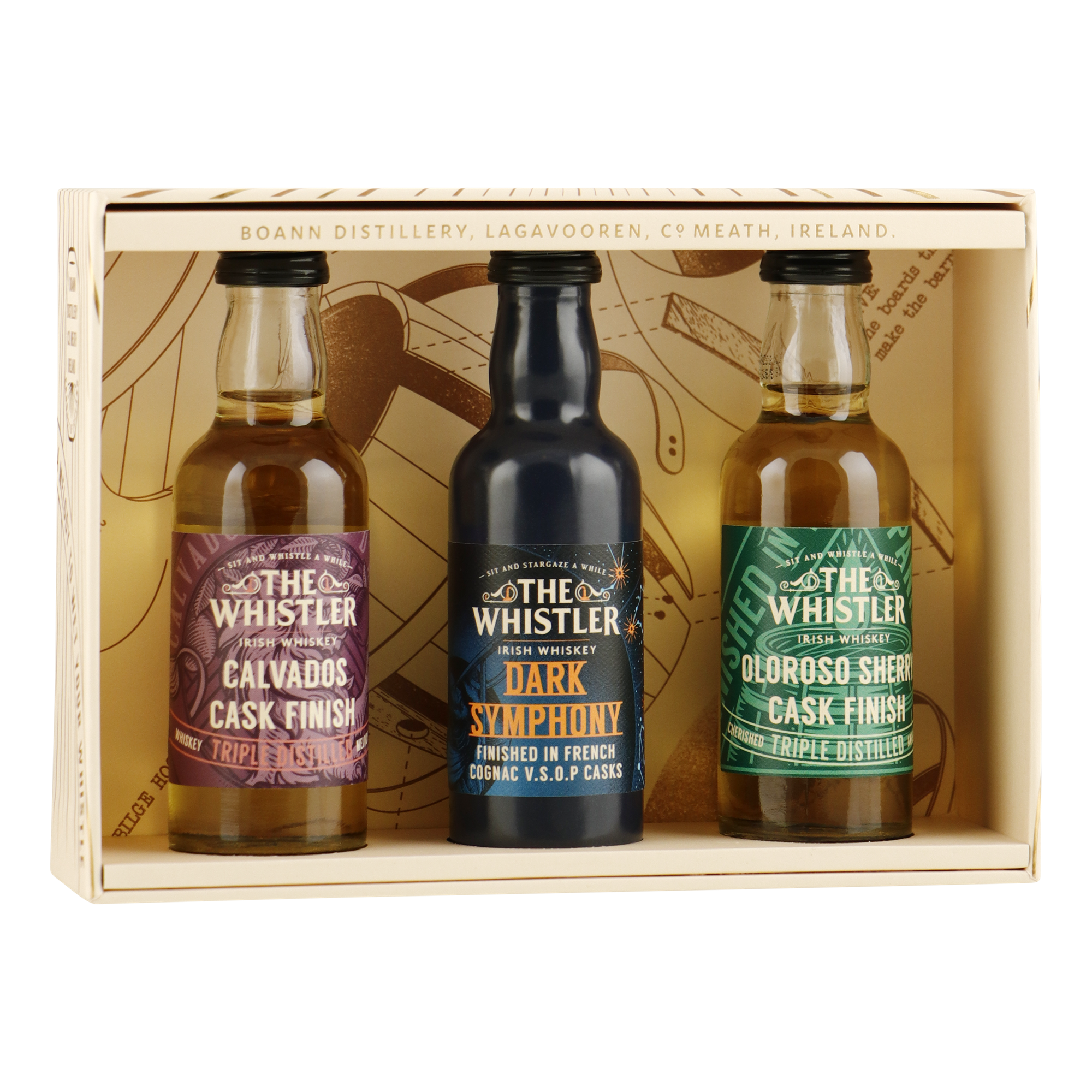 The Whistler Irish Whiskey wordt gemaakt in de Boann Distillery in het hart van de Boyne Valley. Ook dit giftpack van The Whistler, met drie verschillende varianten, komt uit deze vallei. Dit giftpack bevat de whiskey varianten Oloroso, Dark Symphony en Calvados. Erg leuk om cadeau te geven, maar ook zeker net zo leuk om zelf de verschillende stijlen van The Whistler te ontdekken!