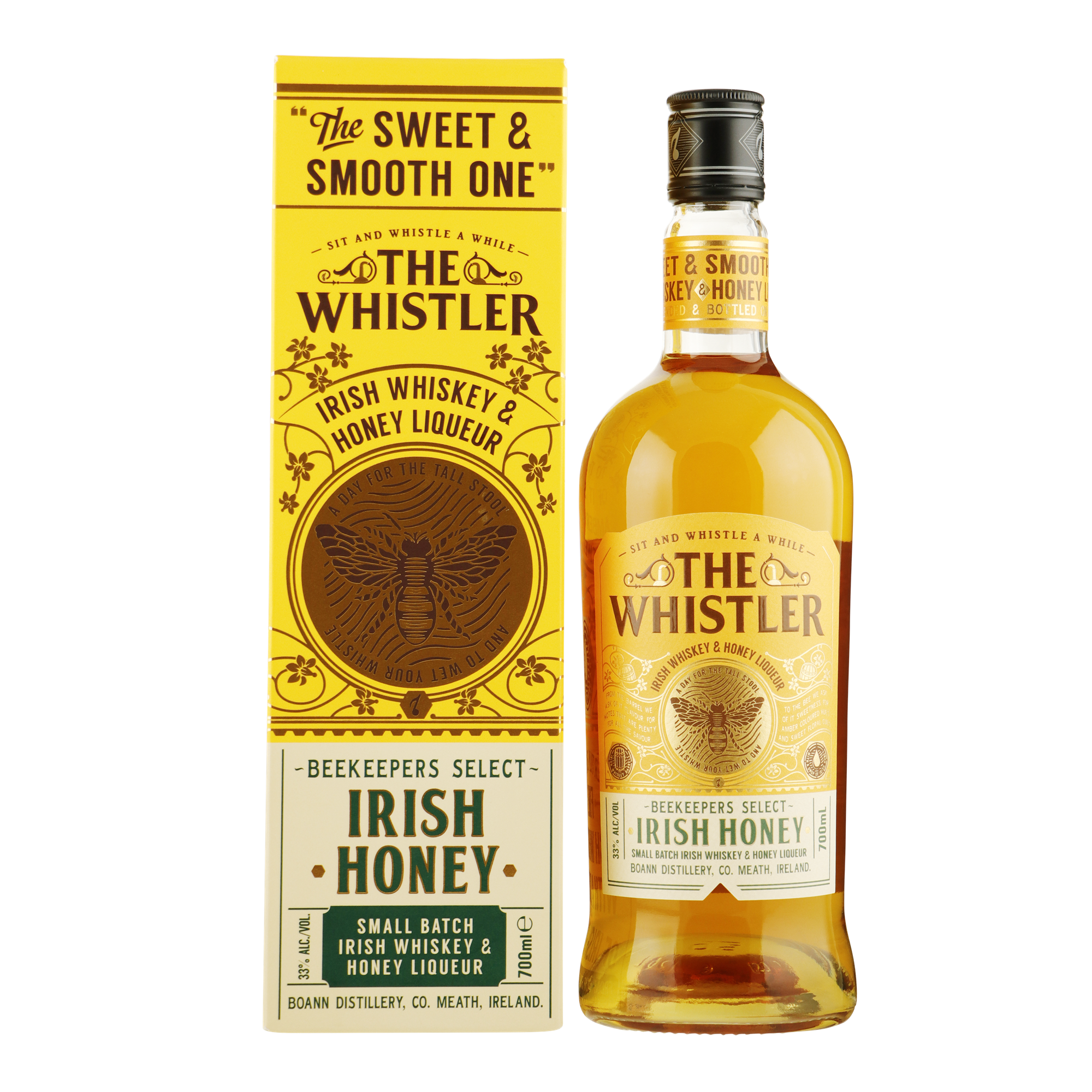 The Whistler Irish Honey is het resultaat van een natuurlijke samenwerking tussen familie-imkers en een passie voor Ierse whiskey. Deze unieke whiskey likeur begint met zorgvuldig geselecteerde Ierse whiskey, gerijpt in ex-bourbonvaten en gefinished op sherryvaten. Vervolgens wordt hij verrijkt met honing, afkomstig uit de eigen boomgaarden van de familie.