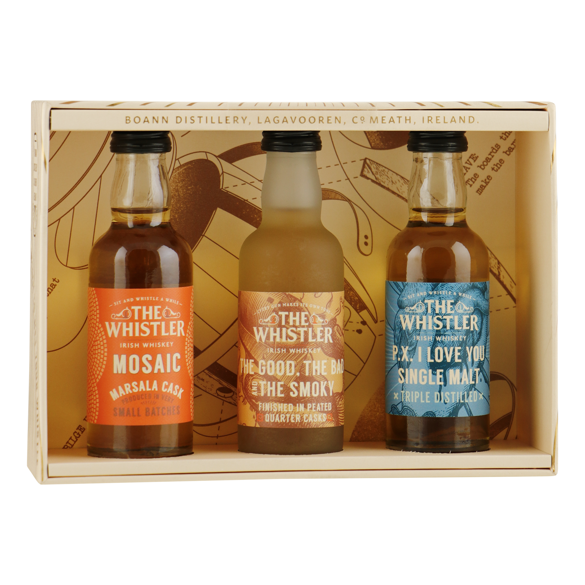 The Whistler Irish Whiskey wordt gemaakt in de Boann Distillery in het hart van de Boyne Valley. Ook dit giftpack van The Whistler, met drie verschillende varianten, komt uit deze vallei. Dit giftpack bevat de whiskey varianten P.Z. I Love You, The Good, The Bad and The Smokey en Mosaic. Erg leuk om cadeau te geven, maar ook zeker net zo leuk om zelf de verschillende stijlen van The Whistler te ontdekken!