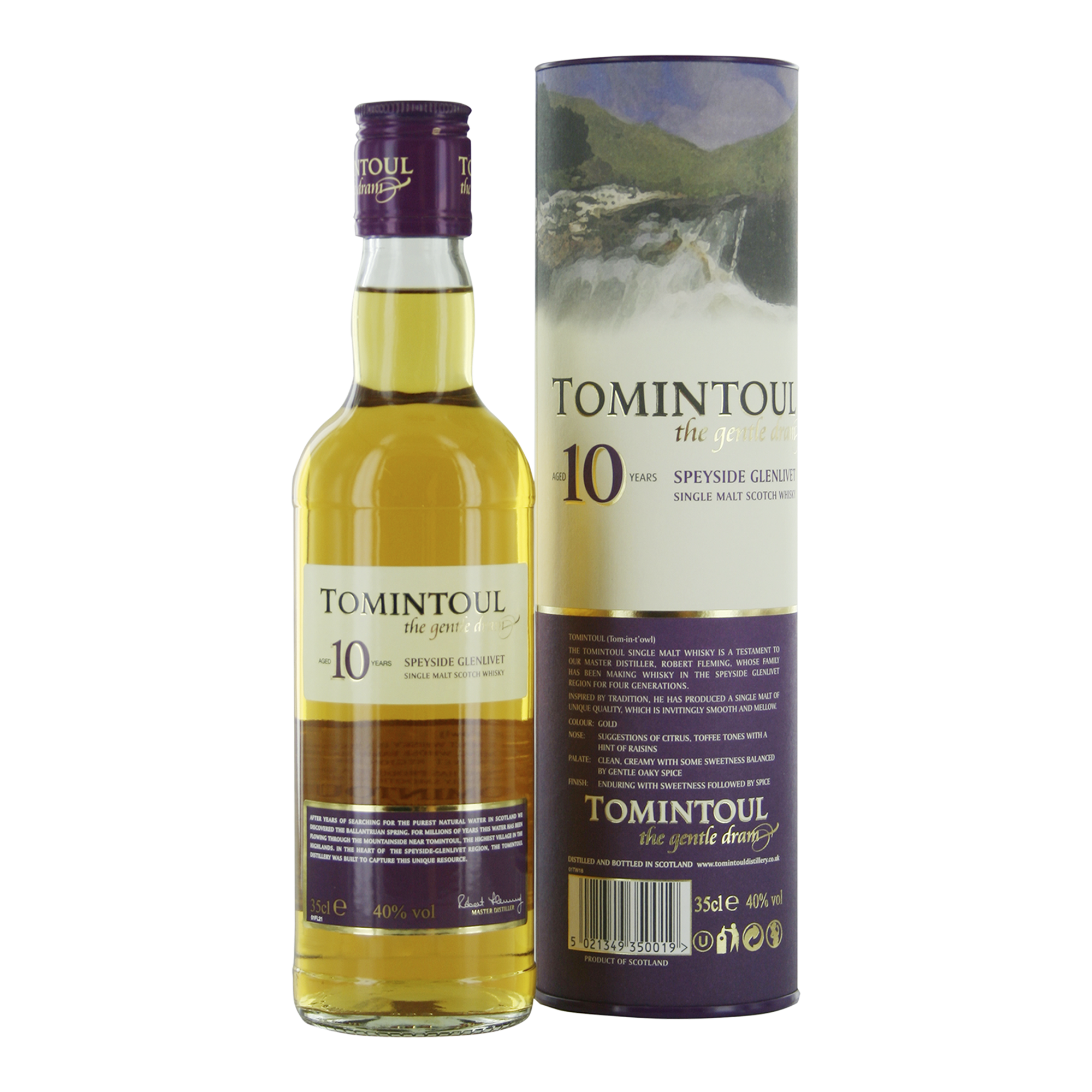 In het midden van de vorige eeuw duurde het meer dan een jaar om een waterbron te vinden die benut zou kunnen worden om malt whisky te produceren. De zoektocht eindigde met de ontdekking van de Ballantruan Spring, een bijzondere bron met het zuiverste water, genesteld in de Cromdale Hills. Vlakbij, aan de majestueuze Avon River, werd vervolgens de Tomintoul Distillery gebouwd. De natuurlijke omgeving, de hoge ligging, de zuivere lucht en de hoge kwaliteit water uit de Ballantruan Spring dragen bij aan de uitzonderlijke kwaliteit van Tomintoul Speyside Glenlivet single malt: "the gentle dram". Angus Dundee Distillers, de eigenaar van de Tomintoul Distillery, bracht samen met een team van goed opgeleide medewerkers de distilleerderij tot bloei.