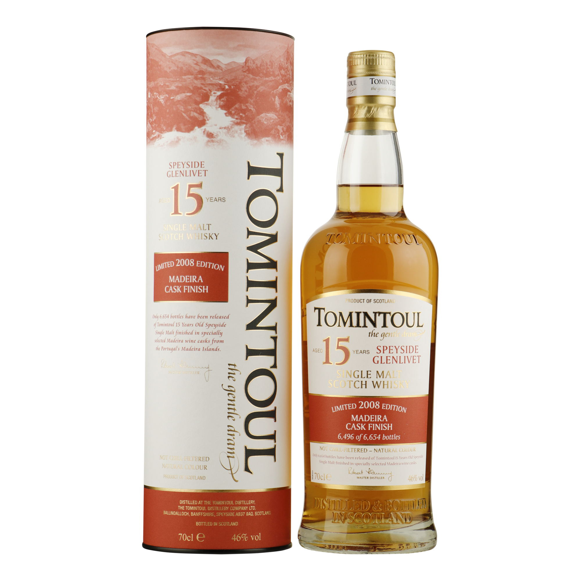 Deze 15YO Madeira Cask van Tomintoul heeft zijn eerste rijpingsperiode ondergaan op Amerikaanse ex-bourbon vaten. De distillatie van deze single malt heeft in 2008 plaatsgevonden. Ter verkrijging van extra finesse heeft de whisky een finish ondergaan op een Madeira vat. De combinatie van Tomintoul whisky’s en wijnvaten staan hoog aangeschreven in de whiskywereld.